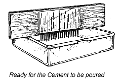 If you use cement, it should be a patching type. Get one that does not set too fast or too slow. Try to get one that sets in about 20-30 minutes. Rocktite brand is a very good brand of cement for this purpose. After mixing the cement or dental stone, fill your box, making sure the cement does not touch the piece of wood. Tap or vibrate your box in order to level the contents. Now set your pin assembly onto the box.