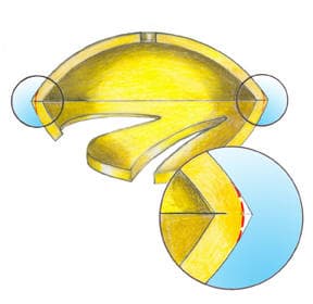 Next the discs were shaped and formed into partial domes using a dapping block and punches. Coarse abrasive paper was used to sand the bottoms of each dome flat. The sharp flat edges as shown in this illustration will provide excess metal to melt into the joint during the pulse-arc-welding process.