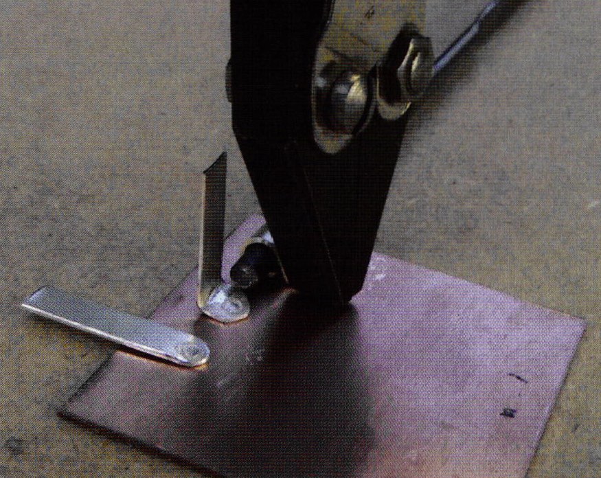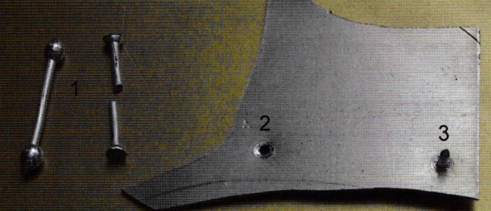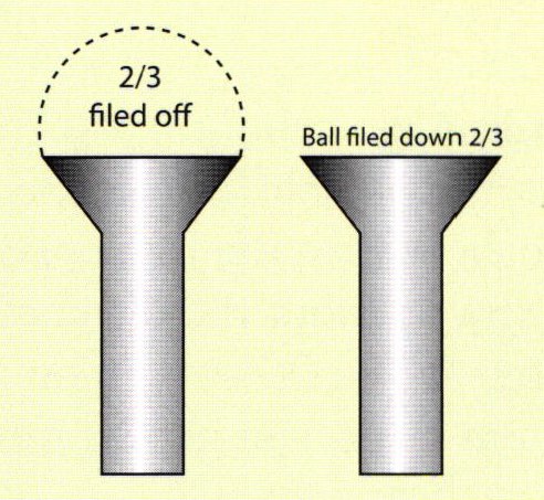 Both the holes of the bar pin and the frame plate must have the same diameter as the wire you make the rivets from. To give the rivets more bearing surface, drill holes conical with a ball drill bit. (Fig. 9). Drill out half of the frame metal sheet and the bar pin finding plate thickness.