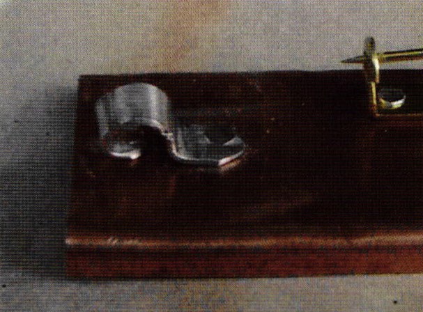 Make a metal strip of 0.5 mm thick x 5 mm wide and 25-30 mm long and rivet it to the frame (Fig. 21). Bend the strip near the rivet to a right angle