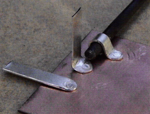Lay a 5 mm diameter iron, drill or the handle of a file tight to the right angle and press down the strip with a flat tool like a flat nosed pliers (Fig. 21 upper right side of photo and Fig. 22). If the strip is too long, shorten it a bit.
