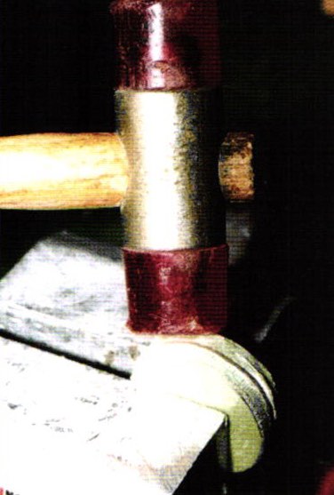 Hammer the silver rim excess over with a mallet or other 'soft' hammer to one side of the plastic sheet. Try not to bend the rim over in one step, do this in about three steps so the rim doesn't build up folds (Fig. 5).