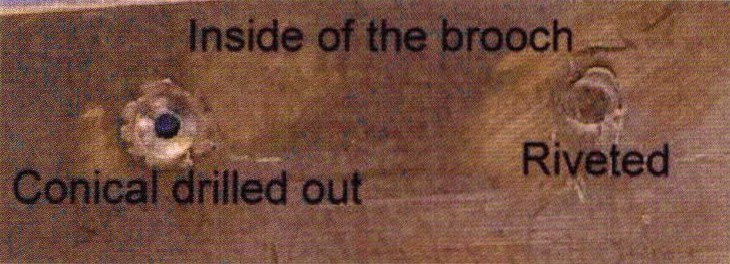 If you don't want to glue findings onto the frame, you can make rivet findings. Most of the commercially made bar pins have two holes in the base plate. If they do not, you will have to drill them yourself. Transfer the hole placement on the bar pin to match them to the metal frame. For brooches, the findings (bar pins) should always be fastened in the upper third of the brooch, otherwise the brooch will fall in front when it is worn.