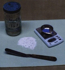 You can measure materials by volume, but measuring by weight is much more accurate. To mix small amounts, a scale that measures to an accuracy of .01 grams is handy. Most will also weigh in grains. This is useful for very small amounts like a teaspoon full. When adding colorants to a frit, designate the amount of frit as 100% and always base the amount of colorant(s) on that. For example, if you have 100 grams of frit and want to add 9% of colorant, find 9% of 100 grams, and add 9 grams of colorant. The total mixture would now weigh 109 grams. If you decide to add another colorant, disregard the nine grams of color you added and once again base your calculation on the weight of the frit. Thus, to add, 3% of another color, find 3% of the 100 grams of frit and add 3 grams of colorant to the mixture. You now have 100% frit plus 12% colorant for a total of 112 grams of material. The reason for this convention is so the materials that make up the frit will always add up to 100%. This makes life easier for any one who might want to tinker with the makeup of the frit.
