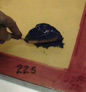 Sometimes mixing the paste with a palette knife is not enough, and specks of colorant** will show in the ink. This nearly always is true of screen printing inks. To remedy this, use a small silk screen or other screen with a very fine mesh. Push the ink through the screen with a palette knife or a squeegee, and the specks will go away. The easiest way to do this is to turn a silk screen upside down over your mixing plate. (See figure 3)