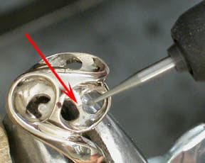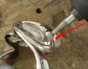 Next a bud burr slightly larger than the overall diameter of the white gold setting was used to create a notch in the ring (indicated by arrow). Flashes of excess metal were removed from the notches.