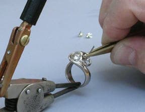 The ring is held in a ring clamp with a copper plate insert (indicated by arrow). The wire from the lead is soldered to the copper plate and attached to one of the terminals. The tweezers are attached to the other terminal and a single pulse of energy is used to tack each setting.