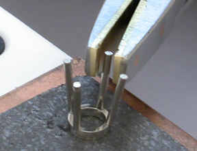 It is very important that the tip of the vacuum pump lead is filed flat and makes good contact with the piece of solder. This image shows four prongs tacked to the lower gallery wire and 1500 platinum solder tacked at each solder joint.