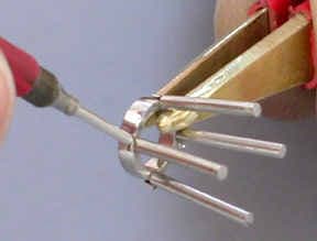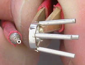 Individual prongs were cut to length from the round wire and filed to a uniform angle at the base of each one. Using the ABI Tack II, each prong was tacked to the lower gallery wire. The contact pad and pliers leads were used with the unit set on 40 volts on the low-energy setting.