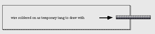 Sometimes, particularly with precious metals such as gold, one doesn't feel like utilizing material for the tang, which will just end up as scrap, so one can take a small piece of brass or even silver wire, and solder it onto the end of the rectangular blank from which one makes the tube. This will serve as a tang to draw with. For gold and similar costly materials it can be a good idea to avoid some wastage by soldering on a wire of a less expensive material instead of making a taper to draw the tube with.