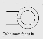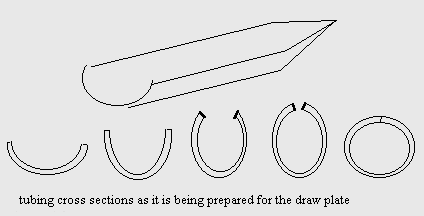 After soldering, any spilled solder is cleaned up, the tubing is pickled, and then it is drawn further until you have reached the outside diameter that you require. One of the things you have to watch out for in making your own tubing is having overlaps of the seam, so when you're closing it up with the hammer, before you even begin to draw, make sure that everything is nice, clean, that the seam consists of even butt joints, and that you have no overlaps occurring.