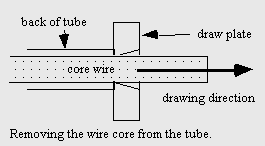 It can also help to lubricate the core wire with oil or graphite (a pencil lead) prior to drawing to ease its eventual removal. A polished wire core helps as well. The way that it would be removed at the end, is by placing the back end of the tube against the drawplate with the wire that's inside fitting through a hole in the drawplate, and then drawing against the drawplate to withdraw the wire from the tube. A very good selection of hard-drawn, high-polished, stainless steel wire in a number of sizes is available from Small Parts Ltd. (see sources).
