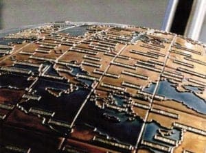 This was given by a certified enameler who was summoned to help. Following her suggestion, Kuettner put frames of copper strips around all the name plates. Not an artistically felicitous solution to the problem but an unavoidable one. Now he could continue with the enameling. Preferably starting with ocean regions that were free of name plates and copper strips.