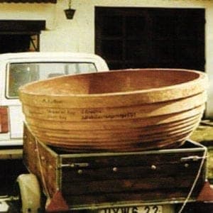 The segments with densely populated areas posed the next problems. Before firing them, a sufficient quantity of enamel had to be applied to the backsides of the segments with closely positioned name plates. Whether the estimate was more or less right or was completely wrong could be ascertained - joyfully or with horror - only after the fired segments had cooled off and a curvometer could be applied to them (the radius had to still be 0.64 m!). It was necessary to position the curvometer crosswise because the curvature had to be correct in every direction. Very, very often that was not the case. Then there was no alternative to crunching corrective re-shaping using the screw press, grinding away or thickening the backing enamel, and then firing them again.