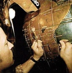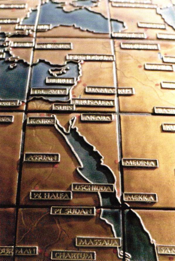 The experimentation with the new material began. The enamel had to be transparent so that the courses of the rivers that were etched into the metal would remain visible. When it was melted on the copper, the local enamel used for jewelry, which was made of cheap raw materials, proved to be unsatisfactory for the intended purpose. In fact, it was unusable. But thanks to a relative who worked in West Berlin, it was possible to smuggle high-quality enamel across the border between the sectors, first in quantities suitable for test firing, later in the required amounts. Unexpectedly many attempts were necessary before satisfactory nuances of color for a blue planet were obtained when transparent blue was melted on the red copper, whose color stubbornly gleamed through. It was comparatively simple to find the right color tones on the warm background for the continental areas.