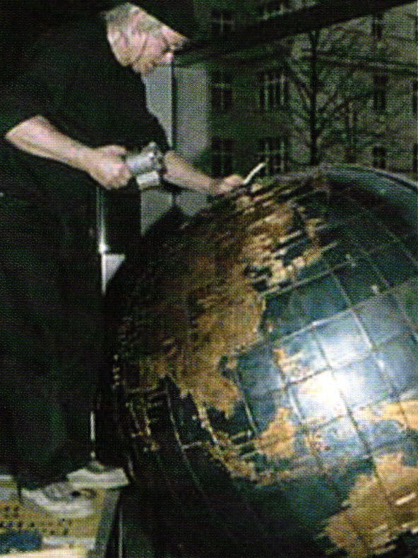 Then it was done. The 578 enameled, polished, and gold-plated parts of the earth's surface were finished, and ready to be assembled. The sphere that would support them was made of polyester reinforced with fiberglass and equipped with an electro-mechanical motor located within it. The individual segments were attached to the sphere with dispersion binder and the spaces between them were then pointed up. The axis of this globe was encased in stainless steel, given an inclination of 23.5°, corresponding to that of the earth's spin axis relative to the ecliptic plane, and provided with a foot so that it could later be installed at some chosen site. In 1988, after 20 years, the re-creation of the world was concluded.