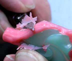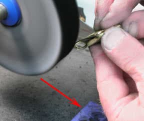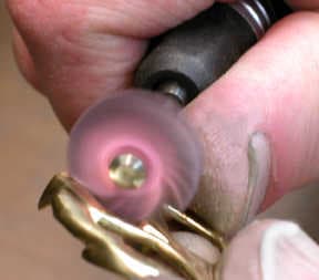 After casting and pre-finishing by Jette, Rod Smith, Jette's shop foreman solders on the pearl post and does some pre-polishing using 3M's Radial Bristle discs. The bristle discs are supplied in a variety of grits and diameters and are designed to use progressively. Here, Smith is using the pink disc which is equivalent to pumice grit. Because there are 6 steps in the progressive system, Smith finds it easier to use the Foredom No. 20 quick release handpiece with a lever-type collet control device to quickly change the tools.