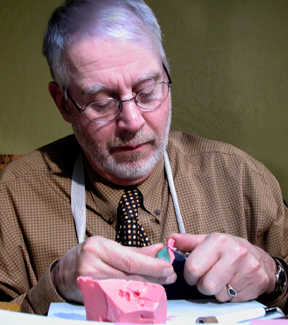Jette puts the finishing touches on the pendant. To build-up the pendant design, he used New York pink wax that he melted into a block. With the Foredom Wax Carver pen and scoop tip, he takes wax from it to create his design around the carving.