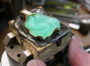 After pre-polishing, Smith places the pendant onto a holding device he's created for use in his engraving block. He made the device from wood and uses doping wax to hold the objects he's working on. To mount the pendant in the holding device, Smith heated the wax and carefully and placed the pendant on it. After the wax has cooled, Smith placed the carving in the pendant. It's now ready to set.