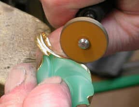 After the setting is completed, Smith removes the pendant from the holding device and cleans it in denatured alcohol and the ultrasonic. After the pendant is cleaned, he uses a graver to bright-cut the top portion of the bezel that he hammered. Next, he uses Foredom Rubberized Abrasive Wheels. They contain ceramic abrasives and run cooler than standard rubber wheels. There are six wheels in the progressive system and the grit ranges from 120 (coarse) to 1500 (super-fine).