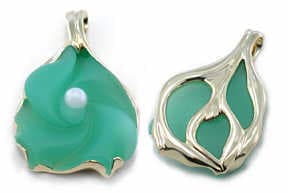 This article features the manufacturing steps for a one-of-a-kind free-form pendant designed and created by Barney Jette . The center stone is a one-of-a-kind chrysoprase carving by Steve Walters, Ramona , CA and is highlighted by a cultured pearl.