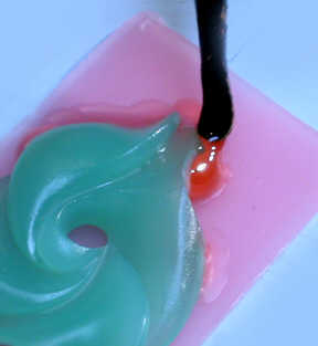 Jette begins by smearing a light coating of oil over the carving. This will keep the wax from sticking to it during the build-up process. Next he places the carving over a piece of sheet wax that's about 1.4 millimeters thick. He uses his Foredom Wax Carving pen with the scoop tip to build-up wax around the carving.