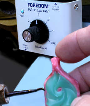 After the basic shape is formed, Jette does additional work, building-up and forming various parts of the design. The Foredom Wax Carver wax pen features a compact control box, an extremely flexible cord with a lightweight cork-insulated handpiece. It comes with 3 popular shape tips or with a complete set of all 7 tips. Tips are available individually. All tips are made of brass and can easily be reformed or shaped to meet the user's specific requirements.