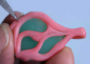 After creating his design, Jette trims away excess wax and shapes the perimeter of the framework using a scalpel, wax files and other wax tools.