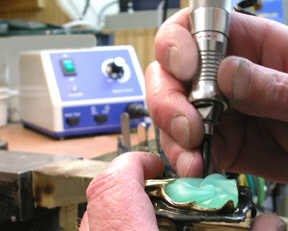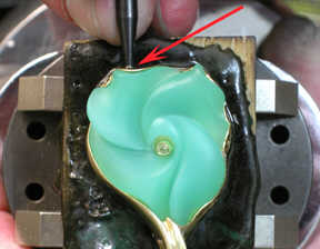 He hammered metal downward closing the free-form bezels at the bottom of the pendant first. Next he uses inward pressure as shown in this photo to tighten the assembly. Then he works his way toward the top portion of the pendant, securing the carving.