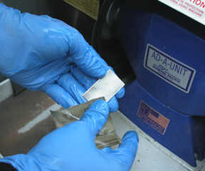 Next Allard individually sands the sheets using a three step abrasive procedure. After the abrasive procedure is completed, the sheets are rinsed and dried by blowing them off with nitrogen. They are then placed in a vacuum chamber to pull off any remaining water vapor.