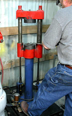 Next Binnion reduces the thickness of the billet by 30 to 60 per cent. This step also increases the integrity of the bond. To do this, he will heat the billet to annealing temperatures in a small furnace, then place it in a heavy drop hammer and quickly hit the foot pedal. The hammer drops and compresses the billet. He repeats this process several times to obtain the required reduction.