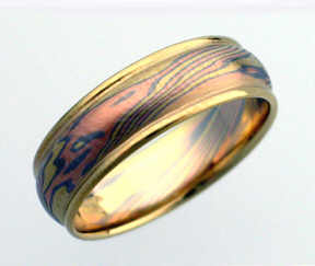 Rails and liners are terms used to describe edge trim pieces and the inside solid flat surface of a single alloy for mokume gane bands. They are optional features on James Binnion's mokume gane bands and here are some examples of how his products are offered: