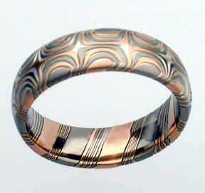 This band has no rails or liner and the mokume gane pattern is visible from all views.
