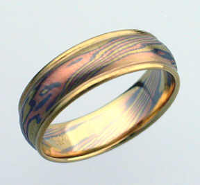 This band has yellow gold rails and a liner. The pattern is visible from the top view. The liner enhances engraving possibilities on the inside of the band making it easier to read. Occasionally certain individuals may have a sensitivity to one or more of the metals in a mokume gane laminate and the liner (made of gold or platinum) inhibits direct and constant contact with those alloys and this can alleviate the sensitivity issue.