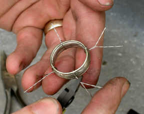 Allard shapes the ring and adjusts the alignment preparing it for soldering.