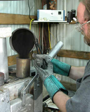The torque plates with the compressed metal are placed into a container and then covered with hot powdered charcoal. The container is then capped and lowered into the kiln for diffusion bonding. The time and temperature for bonding depends upon the alloys. After the bonding is complete, the torque plates and metals are allowed to cool. The newly bonded metal sheets, now referred to as a billet is removed from the torque plates.