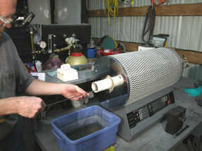 The ring blank billet is placed into a tube furnace for annealing. Argon flows into the chamber creating an inert atmosphere and limiting oxidation. When completed, Binnion pulls the blank out of the furnace and it drops into water.