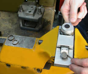 Allard then takes the ring blank and cuts it to length to fill the order. He uses an adapted vice to hold the billet for sawing.
