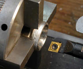 This palladium white gold and sterling silver mokume gane band is being prepared for a 14-karat palladium white gold liner. Here it is mounted in a lathe and the cutting tool will create a flat surface inside the band.