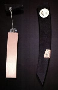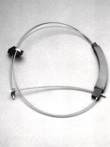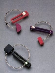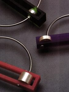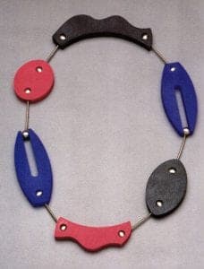 Bruno's Untitled Neckpiece is a large piece that she distilled from a more complicated idea. It is made of six hollow acrylic pieces connected by a simple arrangement of sterling ball bearings and steel guitar strings. Bruno sets up a rhythm of color and shape that is more peaceful and fluid than the Galvanometers. This pieces meanders around in a circle, its soft red, blue, and black shapes suspended in graceful, rhythmic counterpoint; it looks unlikely to spring apart in a burst of pent-up tension. This work is like the sequence in the movie Fantasia, where the conductor is introducing Mickey Mouse to the various instruments in the orchestra. Each instrument makes its sound and the sound appears on the screen as a shape and a color. Several instruments together make several distinct shapes and colors, and the whole orchestra makes a rhythm of shapes and colors. Bruno's medium is plastic, not music, yet she achieves the same sort of harmonious visual translation of tension and balance through color and shape.