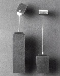 Her pins in the Galvanometer series are a study in asymmetrical balance. The galvanometer is an instrument (from her sacred physics text) used to measure the strength and direction of electrical current, and these pieces are imbued with a directional energy that comes from the suspension of their elements at the ends of the bound wire of their guitar string tethers. Each piece has a focus - a sterling silver element trapped in an acrylic box, the sterling sending back the light, the plastic taking the light and keeping it. The acrylic elements look as though they could fling apart at any minute from the force of their attaching guitar strings. Yet, there is a quirky kind of balance that guarantees restraint.
