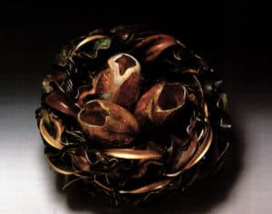 During the past decade, Marilyn's work achieved national recognition. Her signature use of texture and color allowed her work stand out in an increasingly sophisticated field of enamel. This may be seen in Metalsmith Magazine's" Exhibition in Print 2003," sponsored by SNAG. Aaron Faber Gallery in NYC represented her work at SOFA 2002 and 2003. And an unusual collaboration between Michael Good and Marilyn, started through mutual admiration in 1996 at the Baltimore ACC Show, led to enameled gold and silver stands for rare pearls, Octopus Sculpture. They went on to produce Bird's Nests and Eggs, that are exceptional for their beauty. Marilyn added enamel to Michael's anticlastically raised 24-karat gold nest forms and created jewel-like eggs to rest inside.