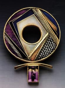 Her retrospective exhibition at the Newark Museum, Capturing the Sublime, The Enamels of Marilyn Druin, June 2003-January 2004, highlights a progression of involvement with enamel art that places her work in a continuum of tradition and beauty. Thirty-eight pieces from the 1960s through 2001 demonstrates her talent and vision. Jewelry, goblets, bowls and brooches reveal the past and future of enamel. Marilyn was very aware of this continuum when she referred to her own work, "What if the next idea is a better one? Most of my pieces become obsolete before they ever reach completion. The creative process is rather linear…. Each new piece is an attempt to complete unresolved aesthetic and technical problems of previous works."