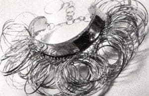 That began the most fantastic and frustrating time of her life. She started thinking about her student with the trach and others who would like to cover malformations or to disguise the holes in the human anatomy surgeons must make sometimes to save lives, as well as those who carry monitors to warn them about heart complications. If she could make jewelry to disguise these life-saving devices, she could help many people adjust. The trach neckpiece was a start, but she knew that what she wanted to do would require engineering expertise. Harry Hosterman was the first biomechanical engineer to help her and, with him, she designed and patented a bracelet that masked a pulse monitor. After that came a jeweled pendant that converted into an oxygen mask.