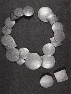 Working with stainless requires months of experimentation, especially with forcing oxides onto a surface that is created to resist contamination. Ultimately, she realized surfaces in gray, orange, black and white patinas. She developed delicate welding processes to attach pieces of stainless to each other, increasing her own knowledge of metal techniques. One of the most challenging pieces of the collection was a necklace with interlocking elements that looked like a small wall of pierced decorative parts.