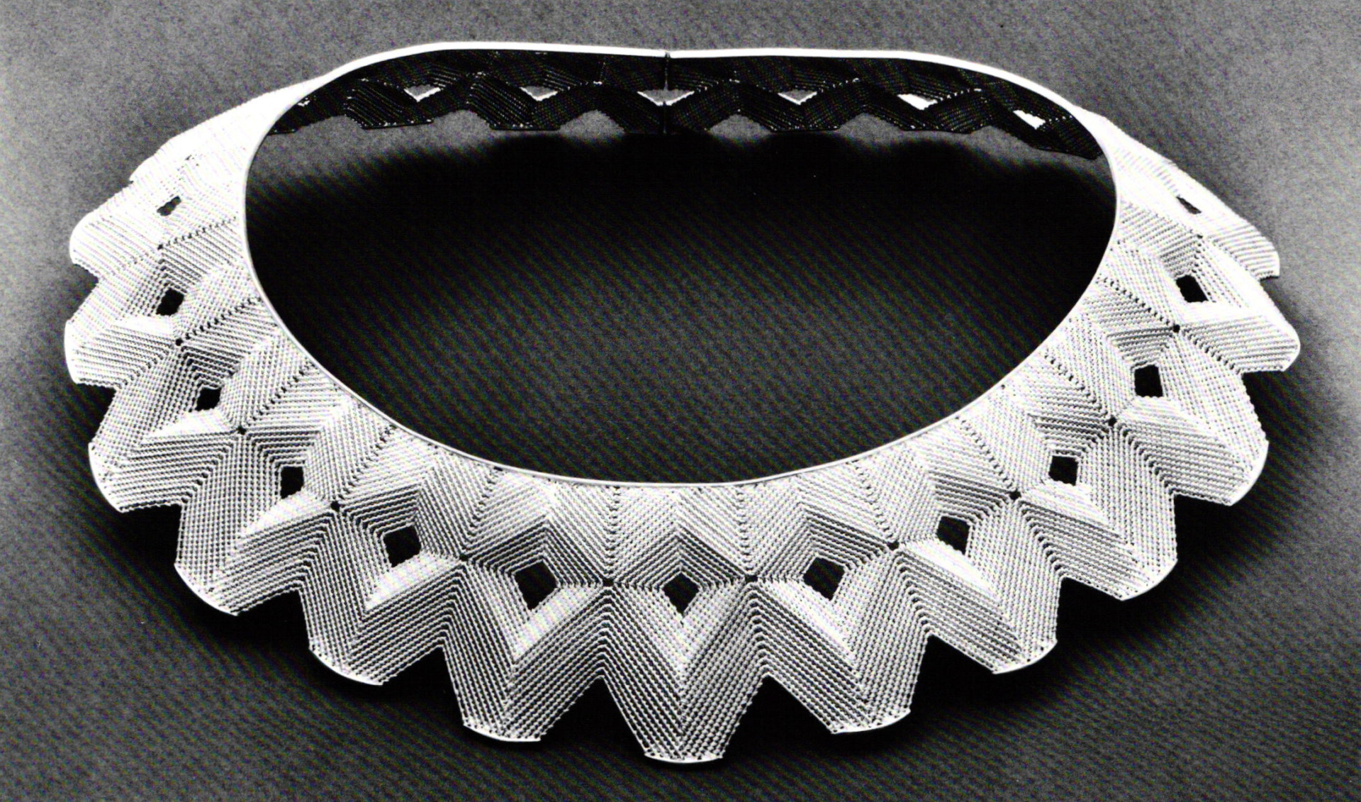 Hu also twined a variety of small shapes that she would cut and combine to make earrings. With her workbench full of such shapes, she pushed some of the x-shaped elements together and realized that the combination of two such elements would create yet another pattern. An invitation to produce a piece of gold jewelry for the 50th anniversary of the Metropolitan Opera Guild inspired Hu to translate that simple idea into one of her finest pieces. The changes and innovations that she had introduced into her work since 1980 are synthesized in Choker 70. the choker is comprised of 22 twined, x-shaped elements. Joined together, the x loses its identity and the eye recognizes the diamond as the dominant shape. The repetition of the individual elements creates both a pattern and a rhythm that is straightforward and easily discerned. But beyond this, Hu crafts a piece that is filled with continuous, reflective subtleties. Within each element, some of the warps are angled, creating facets that catch and reflect light. Each twined element is also positioned at a slightly different angle as it is joined along the oval, thereby multiplying the angles of reflection.