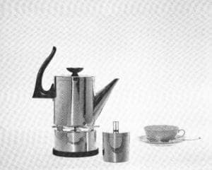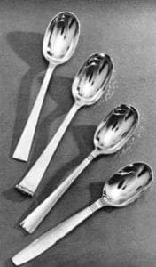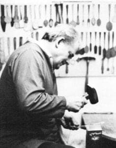 In the early 40s, Allan began designing flatware, which were seen as new and simple, even though he was influenced by the traditional three-tine fork and the oval bowled spoon. His designs were esthetic but always functional. He approaches the design by creating an image in his mind long before putting it down on paper. He feels that there is a fine line in design between the good and the ugly. In order to achieve the former, he often makes a wooden model of the item he is planning to make and then sets it on a bench in the shop so that he and the various other craftsmen can study and discuss it at length.