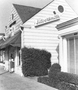 As a young man of 19, right out of high school, Allan Adler worked as a lathing contractor with his own crew of men in association with his father who was a plastering contractor in Burbank, California. At about this time, 1937, we first met and nine months later we were married. Since my father, Porter Blanchard, a well-known silversmith, had no sons and wanted someone to carry on the craft, he urged Allan to come to work for him and learn the trade of silversmithing. Allan and I gave it a lot of thought, because it meant living on a much smaller income, but finally we decided to give it a try and he went to work learning all phases of the trade. In no time he developed a burning desire to do his own designing, with strong leanings toward the unconventional, and the opportunity soon presented itself when his father-in-law decided to give up his retail store and do only wholesale business. Allan felt that it would be great mistake to give up the retail operation, which was located on the famed Sunset Strip in Hollywood. So, with Porter's approval, Allan took over the store, starting in business for himself with lots of enthusiasm and very little money.