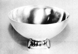 The purpose of Fleming's course was to introduce to North America the old Swedish method of forming and raising silver bowls and vessels featuring pronounced edges. This procedure involved not only the adding of metal to build up the edge, but the use of thick silver sheets that are beaten to a degree of thinness except for the rim. "It gives an effect of great richness and quality," Stacey was quoted as saying. "Wonderful, though expensive." Exemplifying the Fleming method is a raised silver bowl by Stacey that was purchased by the U.S. State Department as part of a collection of contemporary American silverware for circulation in Germany. It was included in the 1950 "Hand-Wrought Silver" exhibition organized for the Metropolitan Museum of Art in New York by Margret Craver, head of Handy and Harman's education department (figure 2).