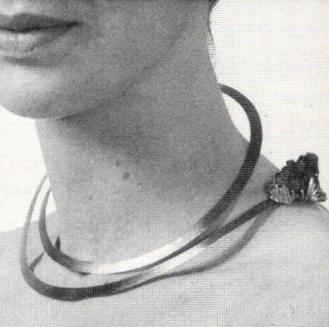 This group was marvelous because of the guidance of Margaret DePatta. Her husband, Eugene Bielawski, was also a metalsmith, and they both were trained in Bauhaus methods at Moholy-Nagy's School of Design in Chicago. It was they who guided us in all our efforts. However, our discussions were lively, as we did not always agree on the purpose of jewelrymaking. With her Bauhaus background, DePatta believed that every design you made should be justifiable, practically mathematical, logical as opposed to emotional. I, on the other hand, work very spontaneously, very emotionally with no anticipation. I acquired techniques as I went along. I remember, for example, that it was a fantastic experience for me the first time I hammered a gold wire flat. All of a sudden I discovered that it was a spring. I bent it and immediately realized I could make necklaces that sprang open instead of having a catch. However, like Margaret DePatta, I was at first very influenced by modern architecture. My things were all very geometric and stark. I had a very close friend who was an architect and I think that had something to do with it also. The first technique I acquired was constructed jewelry, which lends itself to a tailored style.